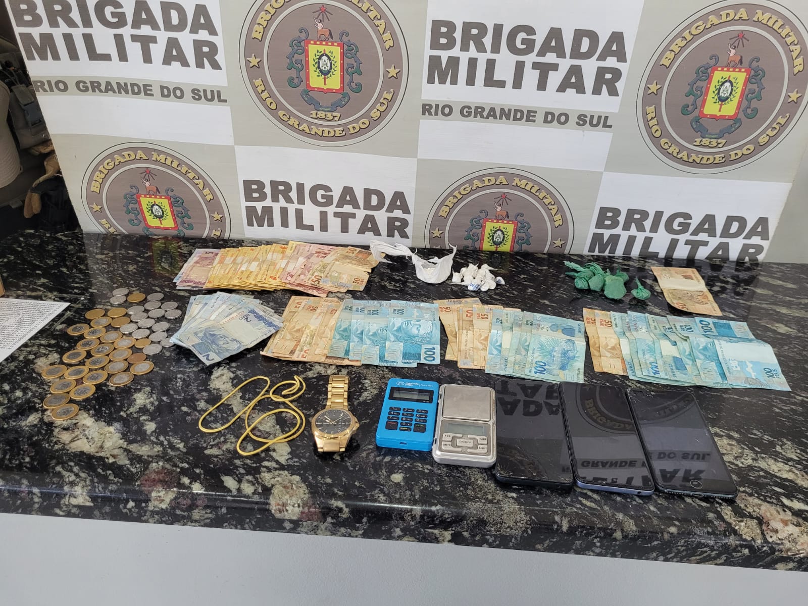 Conforme a dinâmica narrada pela autoridade policial, uma patrulha da Brigada Militar realizava o monitoramento próximo à uma casa utilizada como boca de fumo, ocasião em que flagrou a comercialização do ilícito, ou seja a droga sendo entregue a um usuário. Na procura de mais entorpecentes, o policiais entraram na residência encontrando no seu interior três irmãos, um maior de idade, dois menores, um com 15 e o outro com 17 anos, além disso, foi localizada uma certa quantia de drogas, especificadas como maconha, cocaína e crack. Balança de precisão e dinheiro também foram apreendidos.