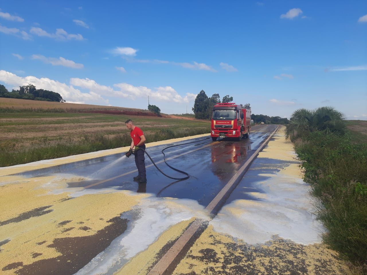 BOMBEIROS FAZEM A LIMPEZA DA PISTA DA 332 ENTRE ESPUMOSO E SOLEDADE POT EXCESSO DE SOJA NA PISTA
