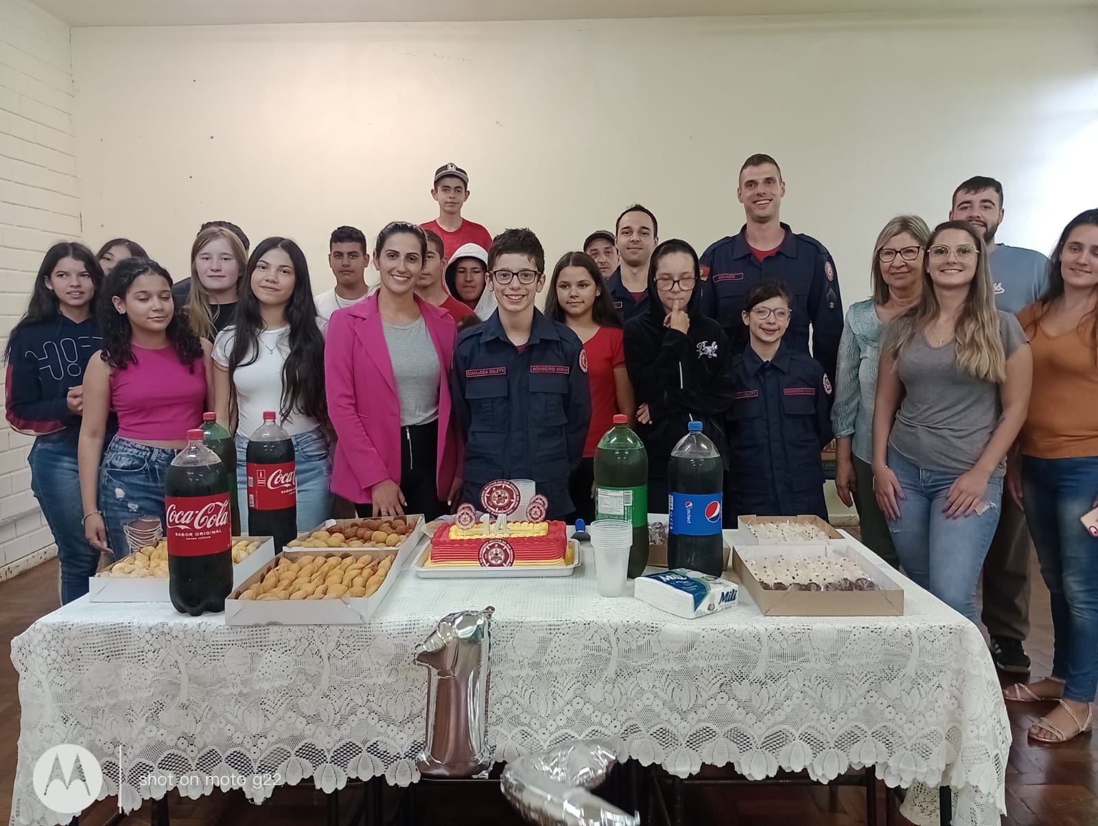 Fã dos bombeiros, o menino Gianlucca Coletti, que completou 14 anos, compareceu pela parte da manhã no quartel da corporação, para convidá-los para seu aniversário a tarde na escola.